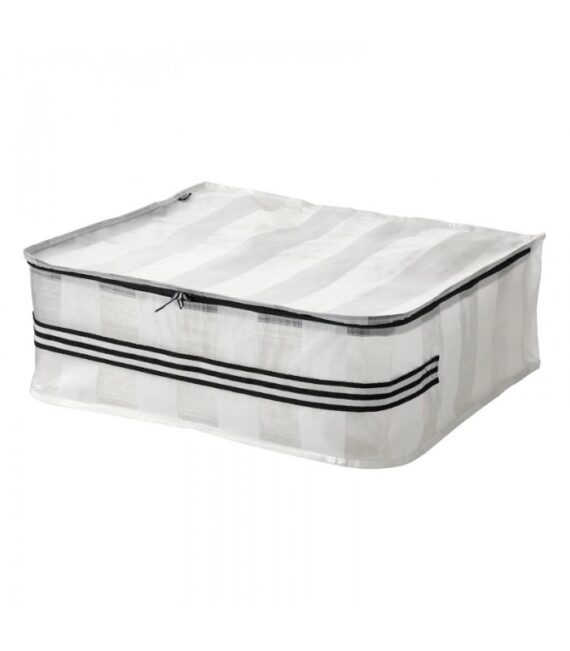 - جعبه ذخیره سازی زیب دار ایکیا مدل PLUGGHAST دارای دسته هایی می باشد که بیرون کشیدن آن را از درون کمد لباسی و یا زیر تختخواب راحتتر کرده است.