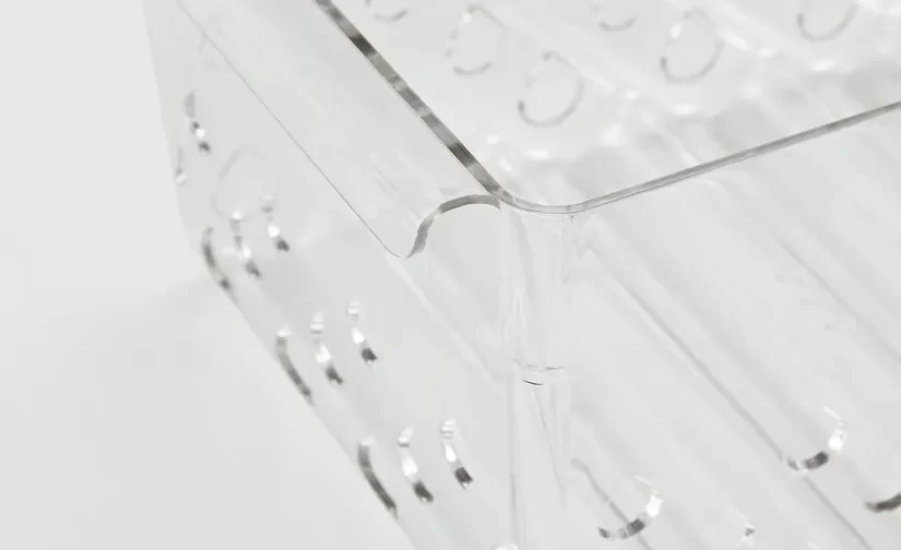 جنس شفاف آن باعث میشود به راحتی بتوانید محتویات داخل آن را ببینید و دستههای یکپارچه، بیرون آوردن سبد نگهداری را هنگام آشپزی آسان میکنند.