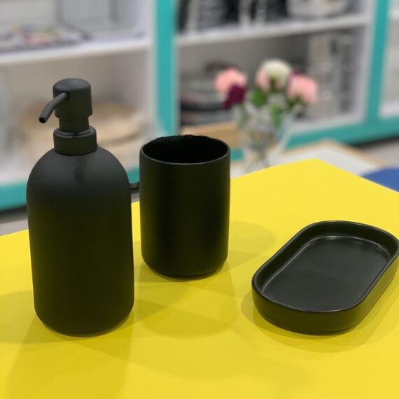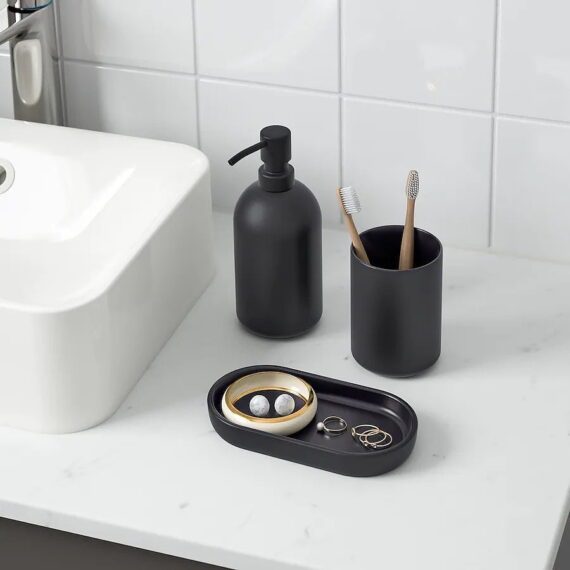 ظروف سنگی مات تیره، حسی صاف و هتل را به حمام شما می بخشد. سینی ست را کنار هم نگه می دارد اما می تواند به طور جداگانه برای جواهرات، شمع یا لوازم جانبی کوچکتر نیز استفاده شود.