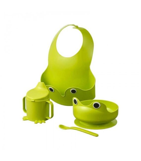 این بسته شامل پیشبند، ماگ، قاشق، و کاسه با تم قورباغه است