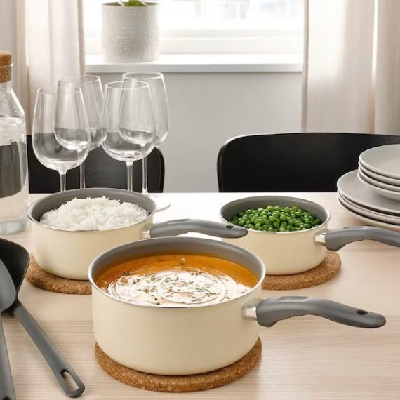 سرویس قابلمه ایکیا مدل KAVALKAD ست 3 تایی بژ روشن با روکش تفلون در ۳ سایز متفاوت