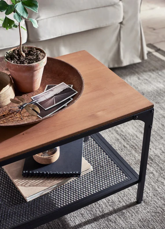 یک میز قهوه دلپذیر و پایدار برای ایجاد ظاهری روستایی در خانه. فلز حسی صنعتی به آن می بخشد و چوب جامد هر قطعه مبلمان را منحصر به فرد می کند. فضایی برای مجلات، کتاب ها و بازی ها در قفسه.