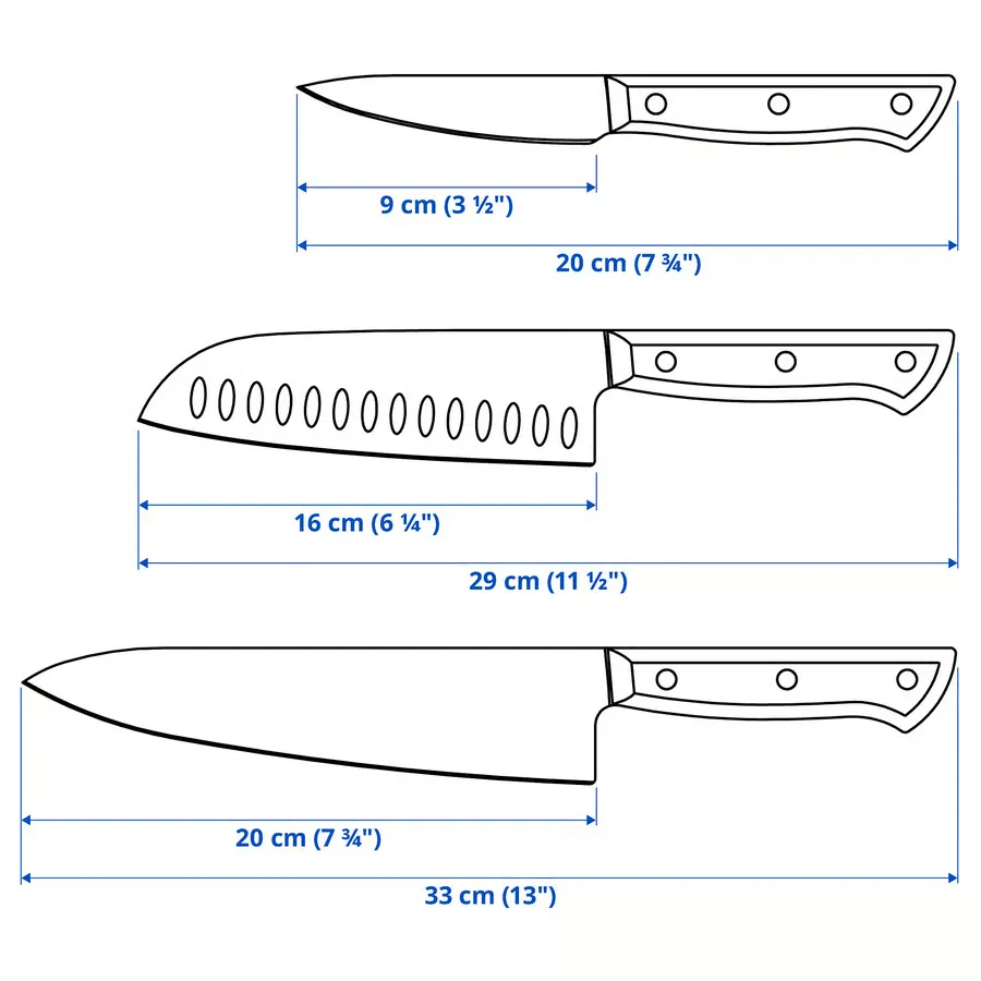 چاقوهای ورداژن (VARDAGEN) از تعادل خوبی برخوردارند، بادوام هستند و برای مدت طولانی تیز میمانند. این ۳ چاقو با دستهای راحت از جنس چوب گردوی تیره عرضه میشوند که برای بریدن، خرد کردن و پوست کندن در آشپزی روزانه شما ایدهآل است.